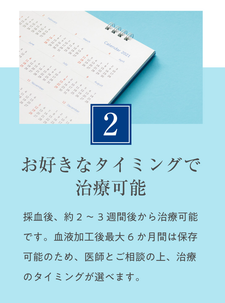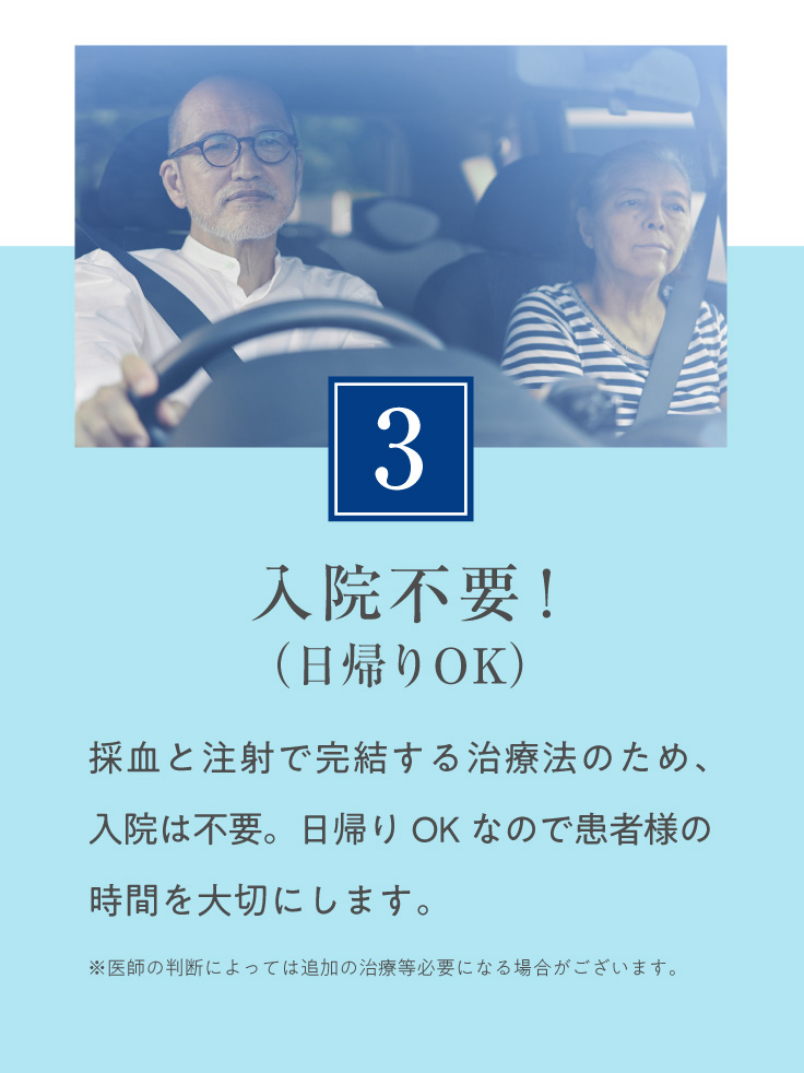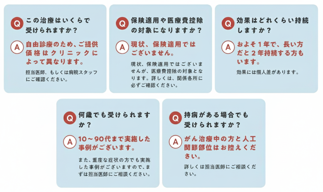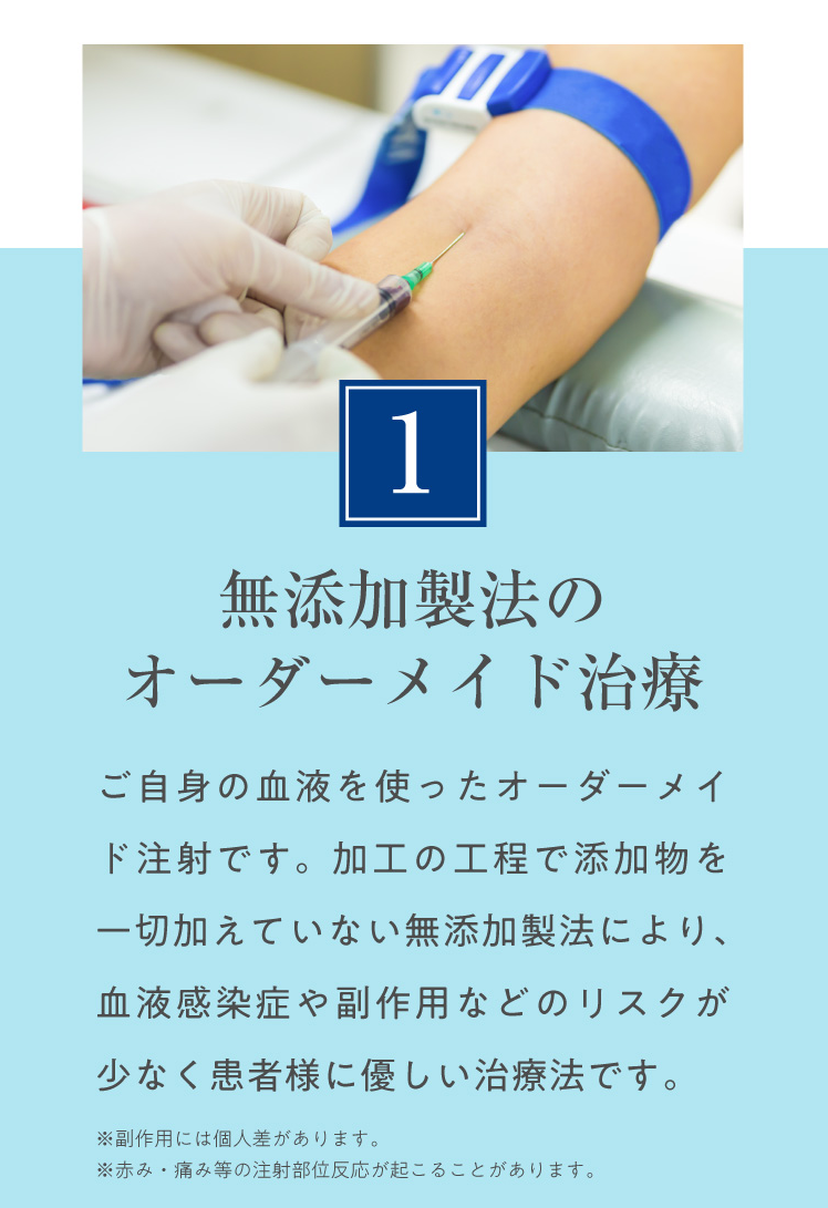 PDF-FD療法は、ご自身の血液をもとに作られる製剤を使用するため、アレルギー反応や感染などのリスクは非常に少ないとされています。ただし、注射部位に一時的な痛み・腫れ・赤み・熱感などの症状が出ることがあります。